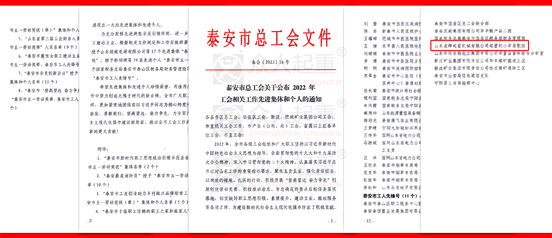 近日泰安市總工會公布了2022年度工會 相關(guān)工作先進集體和個人的公告 榜樣領(lǐng)航 奮勇爭先 龍輝起重小車裝配班光榮上榜 龍輝起重認真貫徹落實泰安總工會精神及重要決策部署,聚焦主責(zé)主業(yè),強化責(zé)任擔(dān)當,積極開展“登高望遠 奮力爭先”創(chuàng)新創(chuàng)優(yōu)勞動競賽,切實做好職工思想引領(lǐng)、素質(zhì)提升等各項工作。 龍輝起重小車裝配班是一支團結(jié)拼搏、開拓進取、敢打硬仗的團隊。自組建以來,主要負責(zé)起重機生產(chǎn)制造、售后服務(wù)等。秉承“創(chuàng)一流攻堅鐵軍”的理念,以精細化管理規(guī)范,以標準化作業(yè)要求,攻堅克難。 生產(chǎn)制造的“上旋轉(zhuǎn)能量回饋智能鐵路集裝箱專用起重機”廣泛應(yīng)用于鐵路轉(zhuǎn)運貨場,安全穩(wěn)定,作業(yè)效率高,替代同類進口產(chǎn)品,榮獲新泰市科技進步二等獎,入選2022年度山東省首臺(套)技術(shù)裝備產(chǎn)品。 制造的“QZ智能生活垃圾專用起重機”在裝卸過程中,能夠?qū)崿F(xiàn)“物料識別、三維掃描、信息交互“等功能,廣泛應(yīng)用于垃圾焚燒發(fā)電廠等環(huán)保產(chǎn)業(yè),深受客戶好評,入選第六批山東省制造業(yè)單項冠軍名單。 為上海電氣定制500+200噸輕量化超大型起重機,創(chuàng)造了新泰市起重園區(qū)近16年來的單機記錄,是市政府大力推動起重產(chǎn)業(yè)集群建設(shè)發(fā)展史上的一個里程碑。 弘揚勞動精神,激發(fā)奮進合力。龍輝起重聚全員之心,激發(fā)建功熱情,充分發(fā)揮了橋梁和紐帶作用,為持續(xù)推動公司高質(zhì)量發(fā)展做出積極貢獻。 |